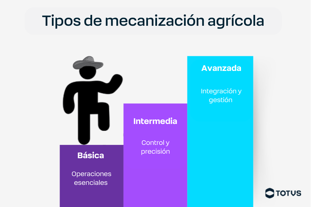 La mecanización puede adoptar diferentes niveles, según el tamaño de la propiedad, el tipo de cultivo y el grado de adopción tecnológica. En general, es posible clasificarlo en tres tipos principales: