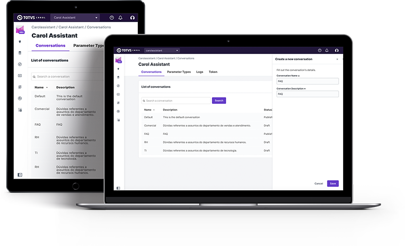 Además, TOTVS Carol Assistente puede trabajar como asistente virtual y permite que tu empresa cree una estrategia totalmente digital de atención al cliente.